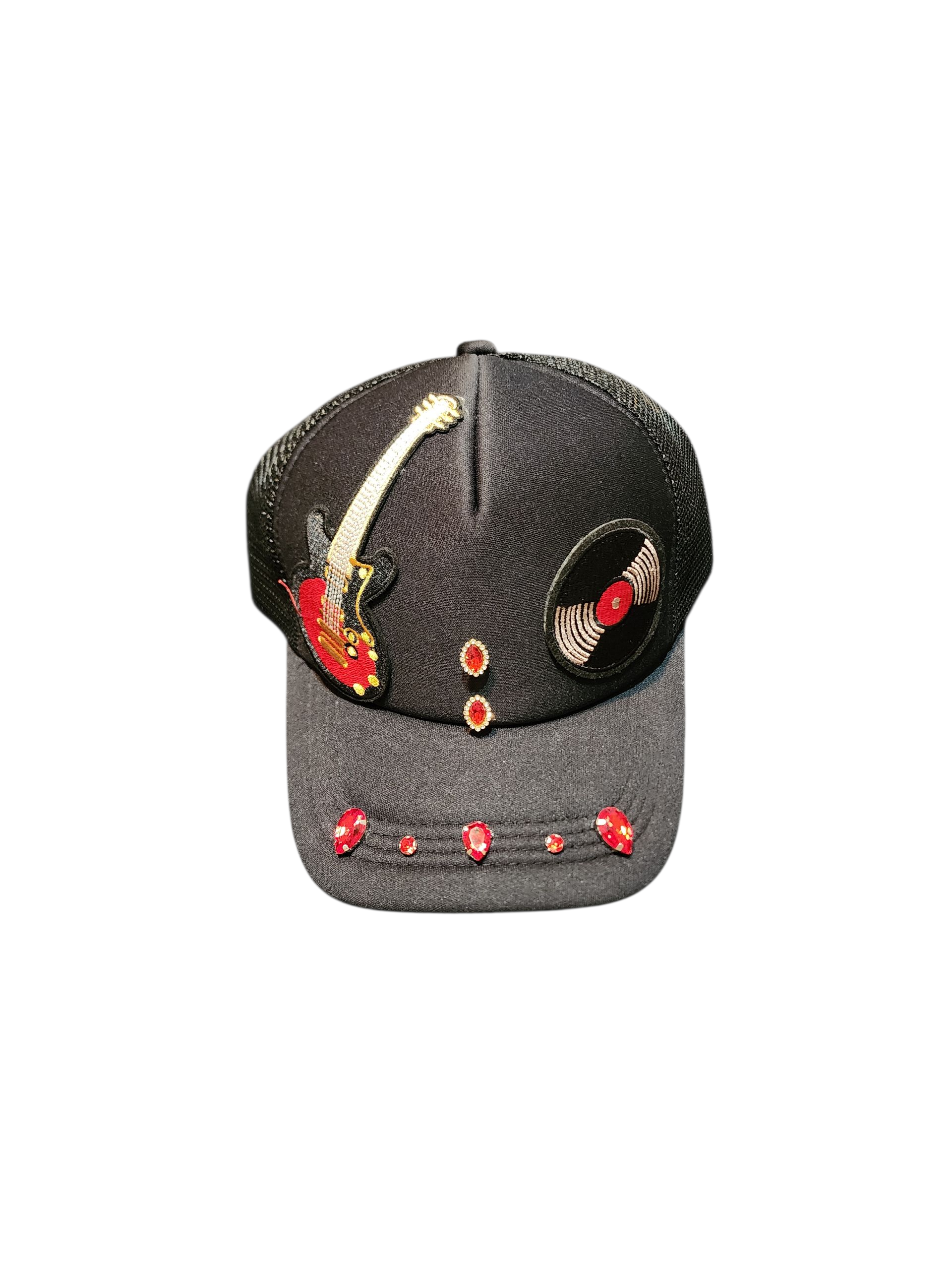 Black trucker hat with a record and guitar 🎸 symbolism music with rubies. Unisex. Polyester and mesh.