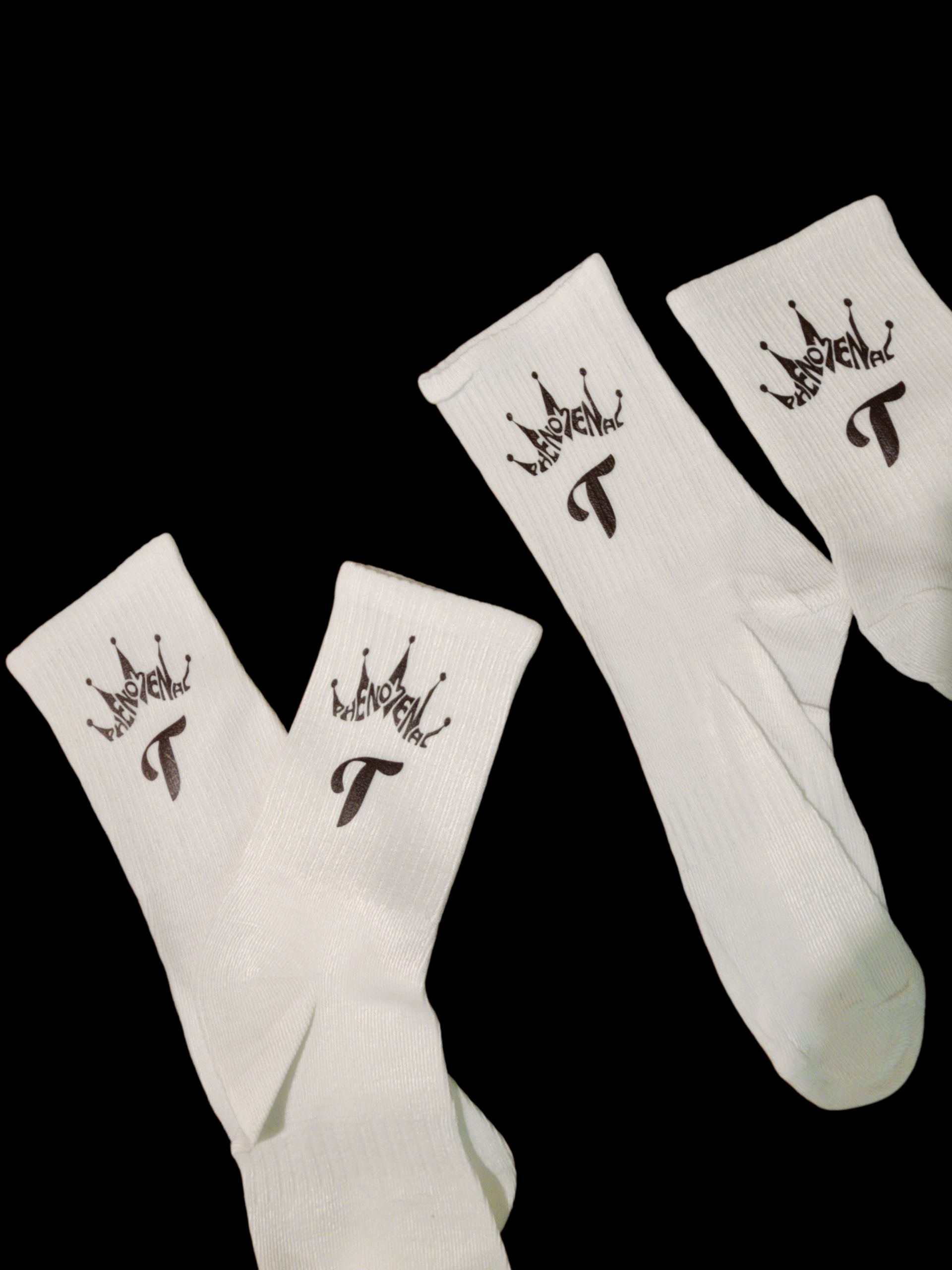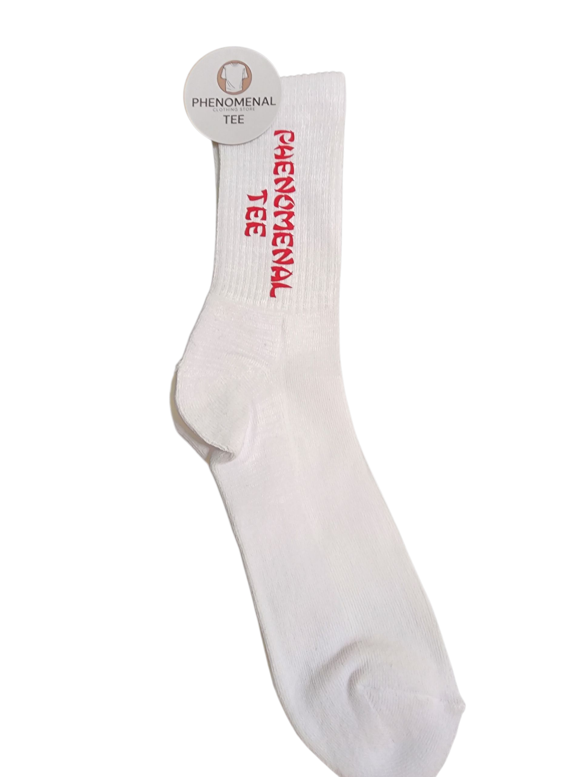 Phenomenal Tee sock are the brand name. 100 cotton. Unisex. Fits size 10-13 adults. Socks are white, with the name in color.